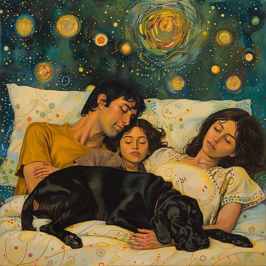 With their fingers threaded, child and dog intertwined and bundled between, his heart swelled. Its beats full and loud, sleep seemed impossible. The dog flipped over, kicked her legs, and placed her head on his feet as a pillow. Half his ass hung off the mattress, with little to none of the blankets left, he was far from comfortable and had but a few hours left before his alarm.