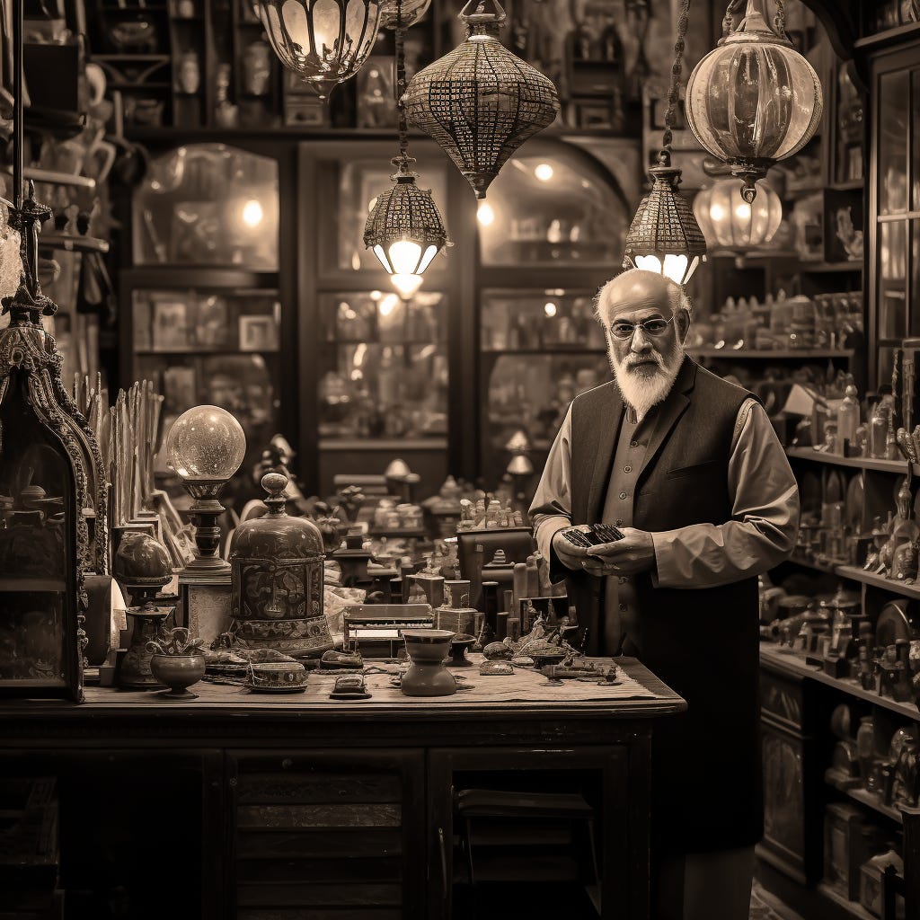 Dumbfounded he sighed. In his daydreams Hamdi had never made it to part after the djinn granted his wishes. He never got to or past the fabled third act. Inevitable lessons, retributions, and balance. And here he was now, on a stool behind the desk of his old antique shop, at a crossroads.
