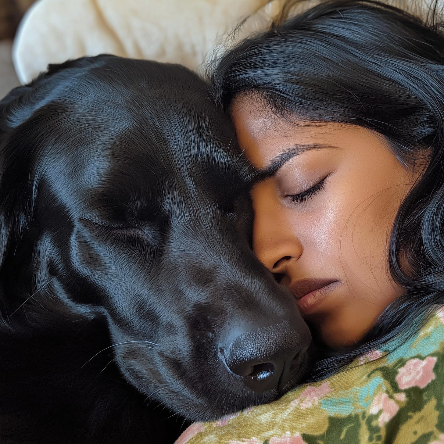 But Rosetta wouldn't let up. Her instincts refused to match the mood. Her tail pattered away against the duvet, drumming a happy rhythm to comfort her ailing mother. With a surrendering sigh Magema sent one hand to wipe the last of her uncaught tears away, and the other under the pooch's collar for a loving scratch. The dog's tail swung faster, Magema's eyes clouded over, and the rains started again. Gema caved into her beloved Rosie's nape and wept into her lush black fur. Rosetta settled, stretched her legs over the balled woman, rested her chin over her forehead, and gave a quiet, sympathetic whine.