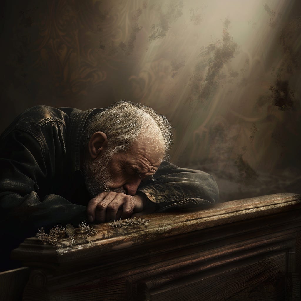 Frank hunched, drowning in his tears, snorting his pouring snot. As he bowed under the altar, in the shadow of the coffin, the welping man felt a palm on his shoulder. When he was ready, he found kindness from the bench before him. And he shook harder. Quaking like his tears would bring his boy back. Shaking like he could go back in time tell him he loved him. That he was good. That Frank was lucky to know him.