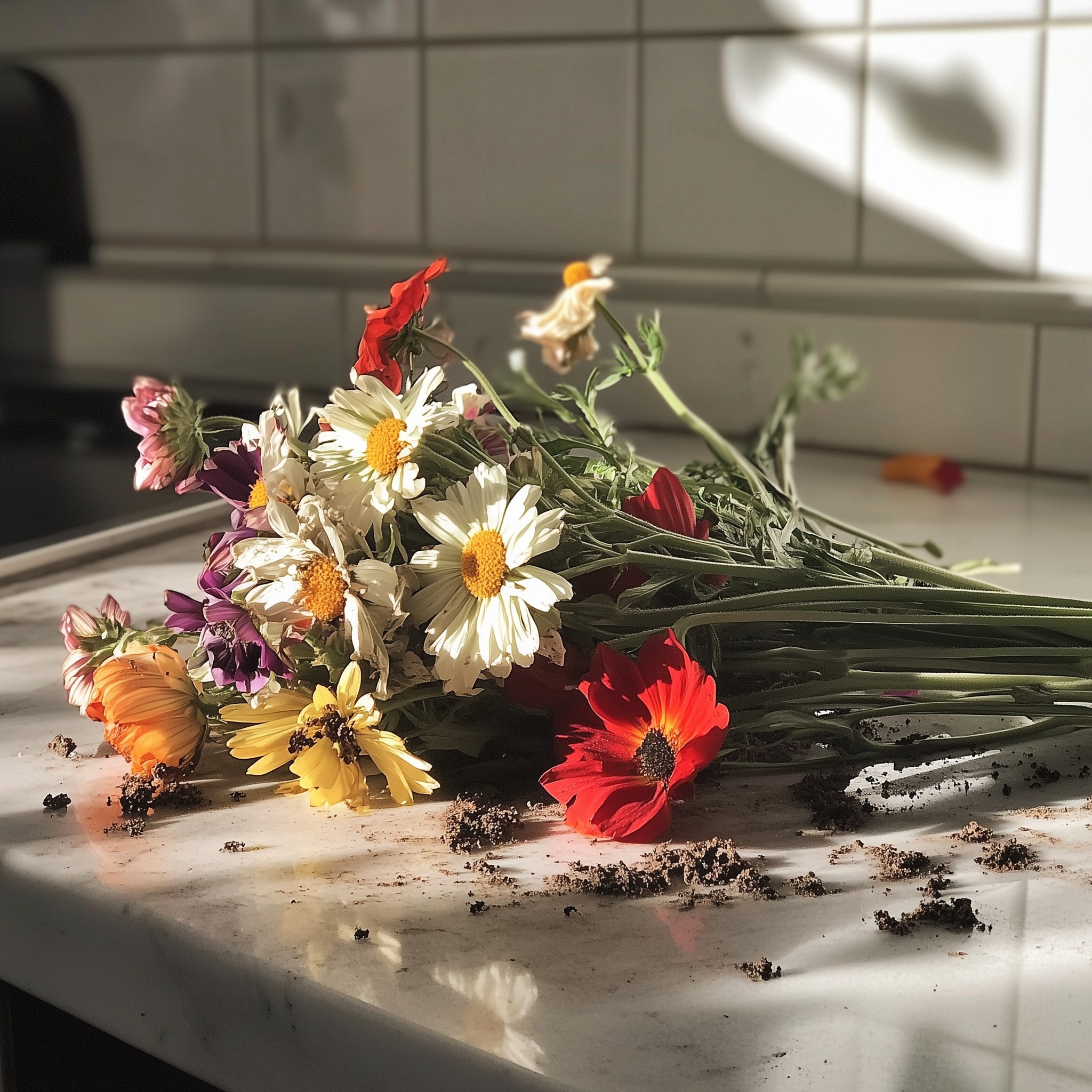 It was miraculous how a screaming curse didn’t escaped past Able’s lips, after he stepped upon the jagged piece of neglected lego. The searing pain rocketed from the bottom of his heel to the base of his throat, and he swallowed it back to drown in his gut full of fiery whiskey, and pissy beer. The young father squeezed the stems of the flowers bundled in his hands, and let out a slow exhale, desperate to avoid making a sound and waking the household. The mere creak of the door, and jingle of his keys, had sent his nervous system haywire.