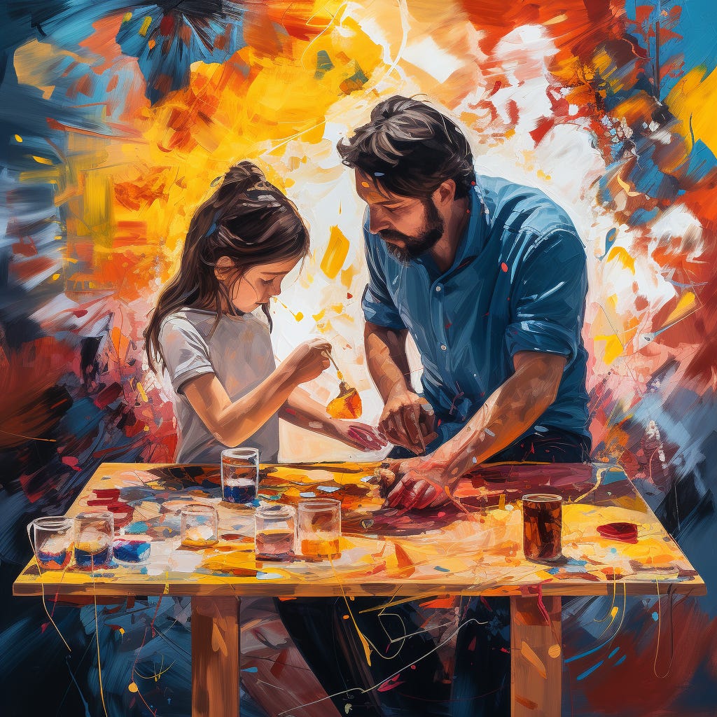 Her brush sopped up the last gobs of aquamarine from the bottom of the can. From the corner of the room, Emmanuella 'heard' the vibrations of her father placing heavy pails of replacement paint to the floor. She could feel him walk over, and pause beside her. He stood just inside her field of vision trying not to startle her, still convinced, like everyone else, that she had no awareness beyond what she could see. Able watched her meditative movements, uneven colourful strokes that disappeared the blank away. Though he always wondered, he knew better than to ask why she insisted every canvas have a base of the same pale sherberty green, or why she wasn't uniform in covering every millimetre. Instead Able placed a soft kiss on her forehead, scooped the empty can beside her, and affectionately messed up her hair. Emmanuella rewarded him with an eye-roll, and lifted her dripping brush like a club, warning of stained clothing in retaliation. He backed away with his hands raised, and blew a farewell kiss as he left his studio.